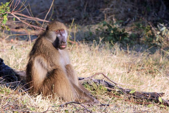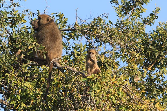 Only a few minutes later we discovered a tribe of baboons — some feeding on the ground, others plucking leaves and fruit from the trees, more just cavorting among the branches, defying death by leaping from branch to branch. Unlike their cousins, the blue faced Mandrills with long red noses, these are Chacma baboons with rather plain features. No less fierce, they roam about in large tribes.