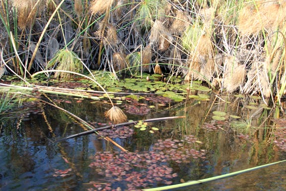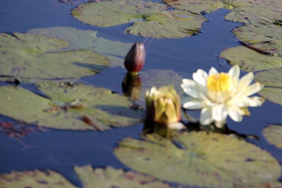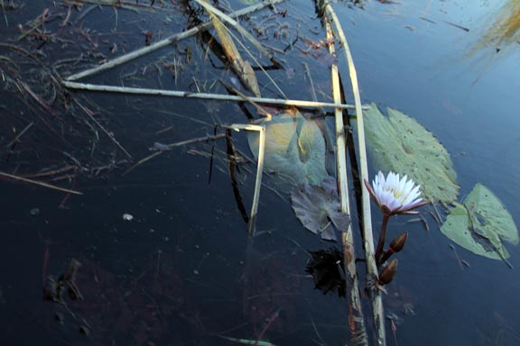 Open areas were dotted with water lilies, some pink but mostly white with yellow petal tips. Now and then we passed trampled down paths leading to and away from the water’s edge giving evidence of elephants and hippos in the area.
