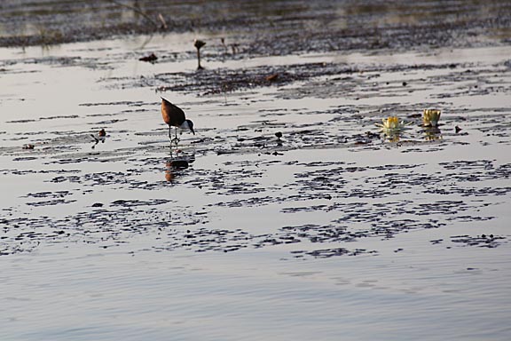 an African jacana in this case, walking on the water from lily pad to lily pad while hunting for a meal.
