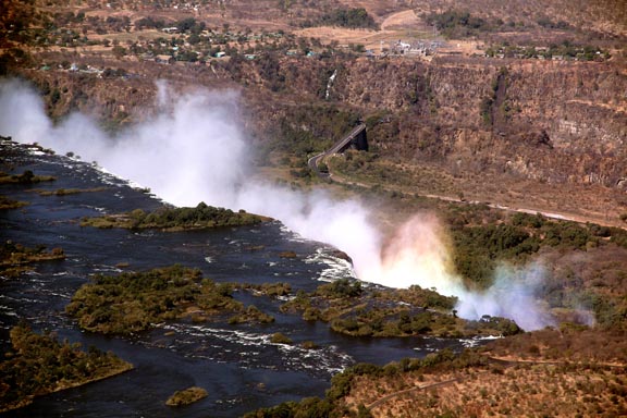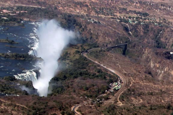 The Zambezi River has, over more than one millennia, carved out tremendous gorges below the falls. The following NASA photo was taken in 2003 from the International Space Station as it flew over the falls at an altitude of 236 miles.