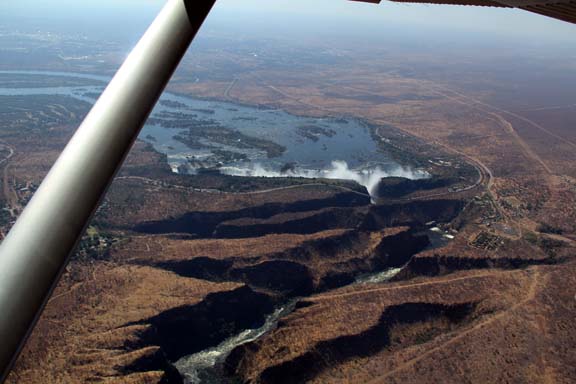 I gave up the left seat to Peter, our tour escort, so I could more easily manipulate my Canon EOS-60D and telephoto lens. When we could see the water vapors from the falls, Peter radioed into the Zimbabwe/Zambia air traffic control system and received permission for our flight of four to make a couple circuits around the falls for photography.