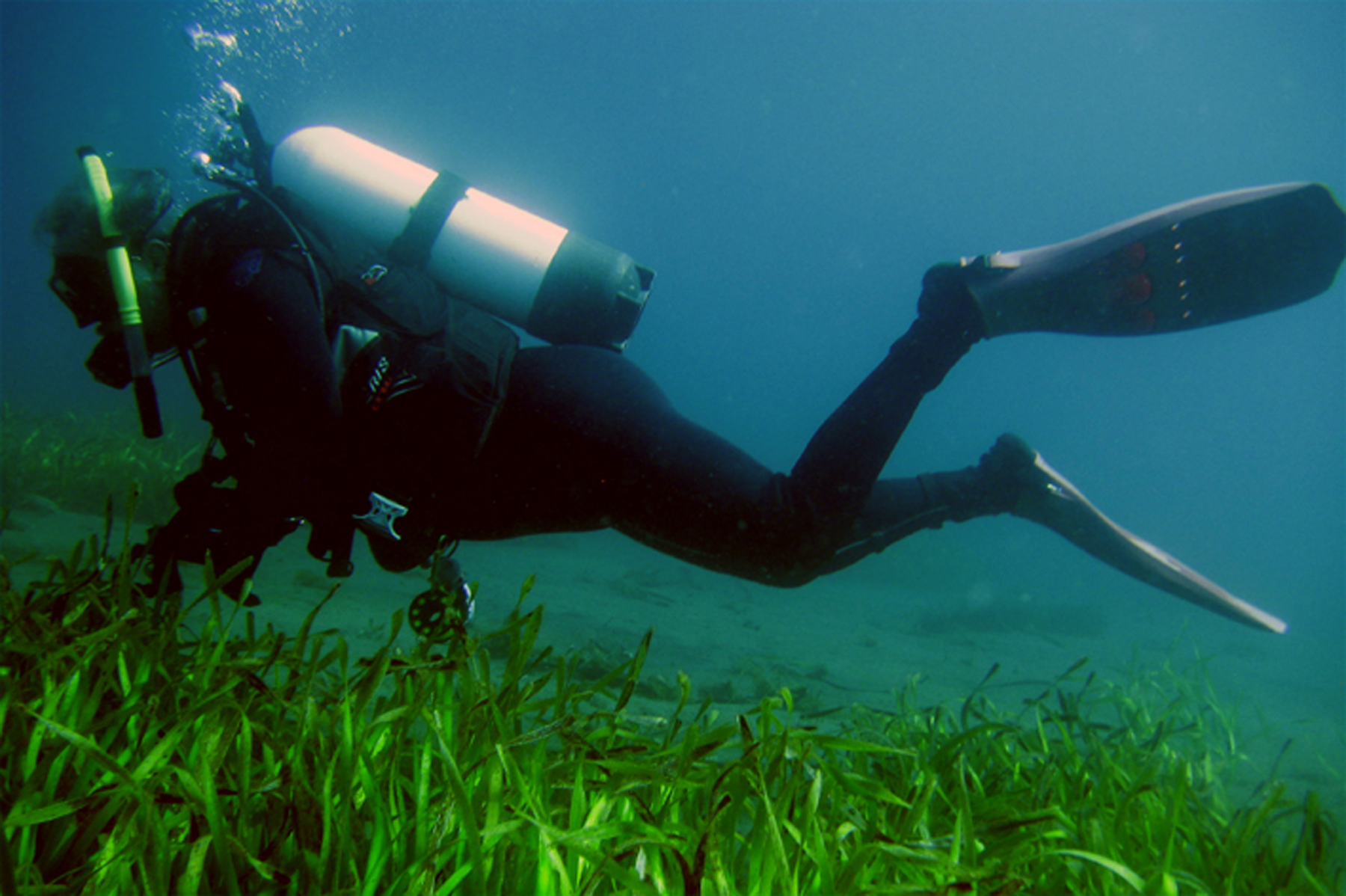 Phil is crusing over a field of Eel Grass searching for a camera target….