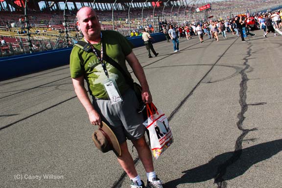 Geoff is actually standing vertical on the 11-degree banking of the front stretch.