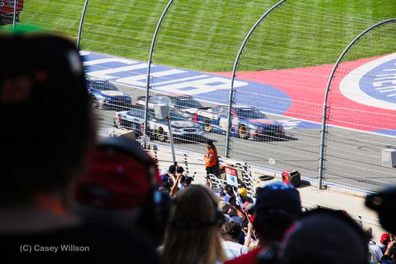 The final restart of the race. Jimmie Johnson in car #48 on the inside went on to win.