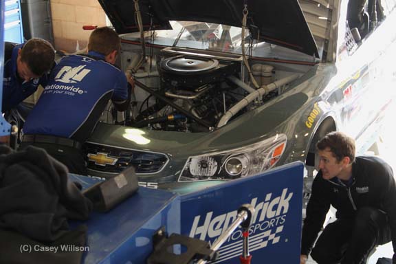 Mechs busy tuning up #88 for Dale Earnhart Jr. between practice runs.